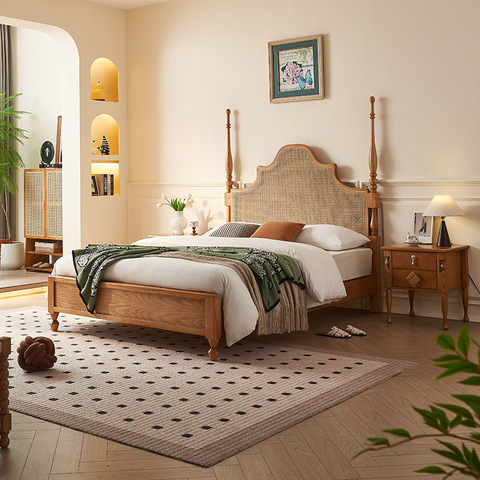 American-Style Double Bed Adjustable Height Nordic Designer Mid-Century Modern Style Solid Wood Rattan for High-End B&B Hotels